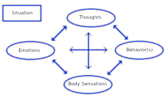 And what's cognitive behavioral therapy? CBT is based on the idea that feelings, thoughts, behaviors, and bodily sensations are interconnected and one leads to the other. And it all starts with a trigger (e.g. someone crashes your car, you fear for your life, think you might die, and flee the scene), a situation where something occurs to you. Now we've faulty thoughts and distortions of reality (for example, we see everything as if it'll lead to a disaster) that distort the thought. When we replace the thought with a more realistic thought and determine and execute a better behavior than what we did before, the next time the situation occurs again, we correct the maladaptive behavior that occurs in mental illness and ultimately reduce the severity of the client's mental illness.
